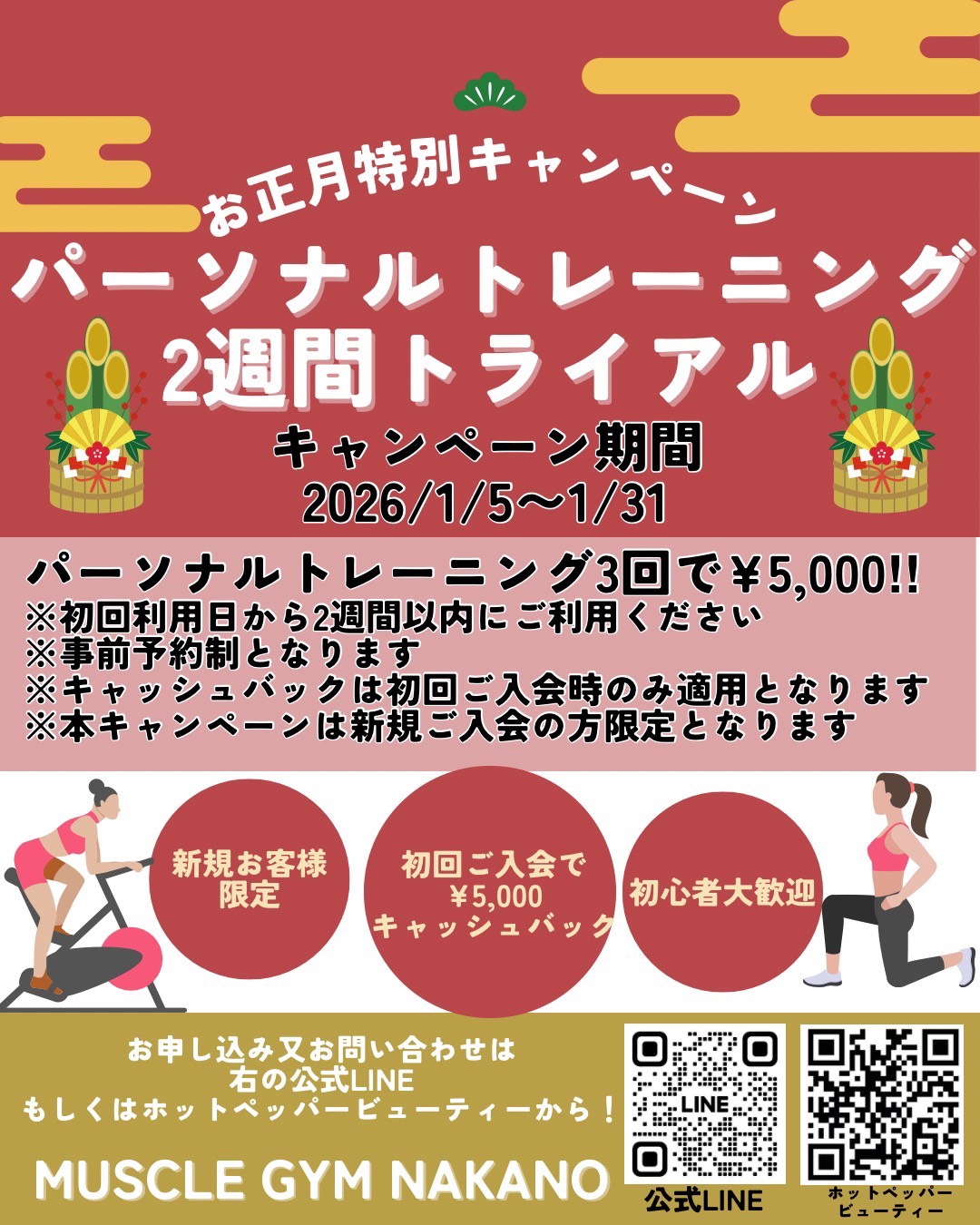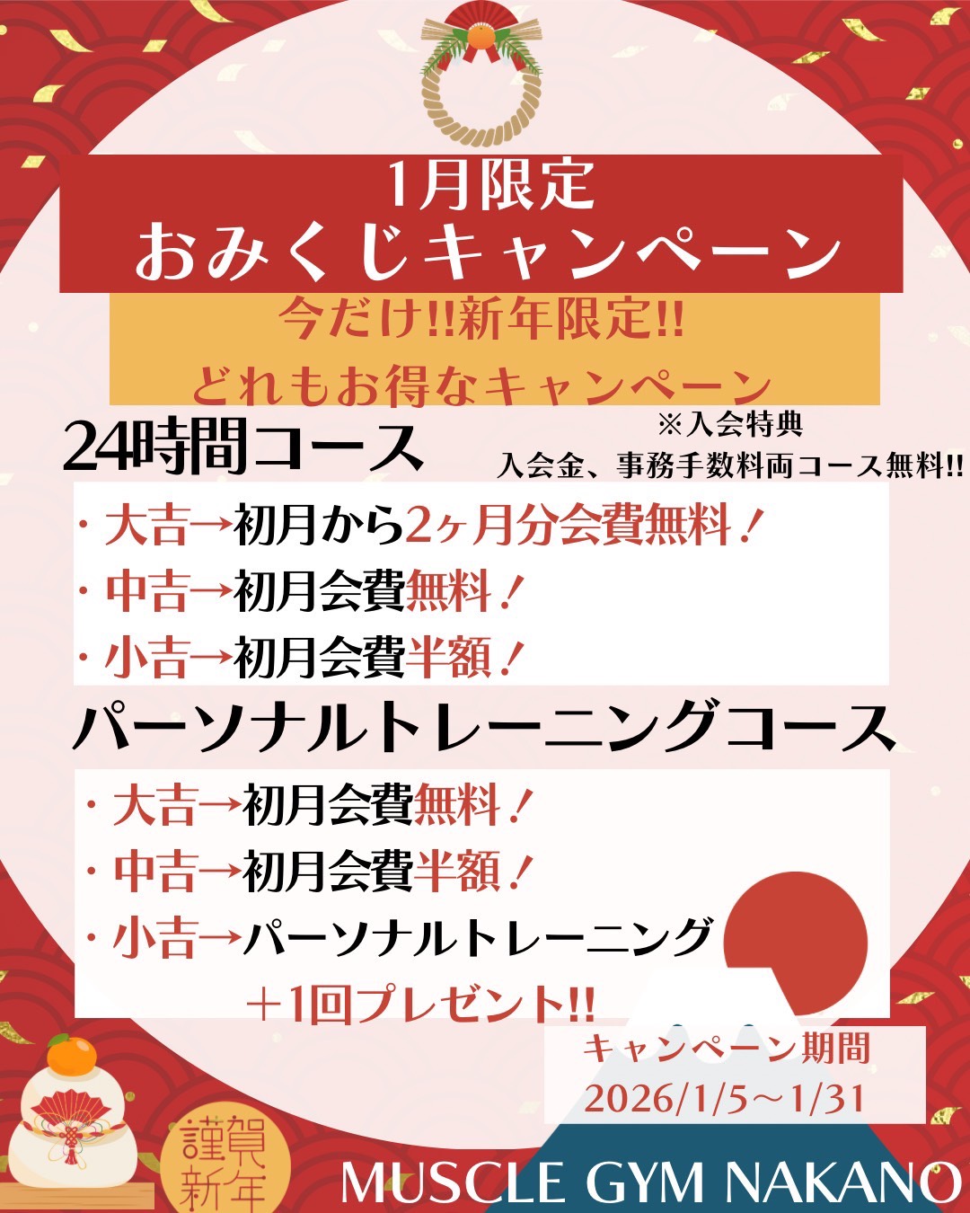 24時間コース・パーソナルトレーニングコースを対象に、1月限定のキャンペーンをご用意しました。