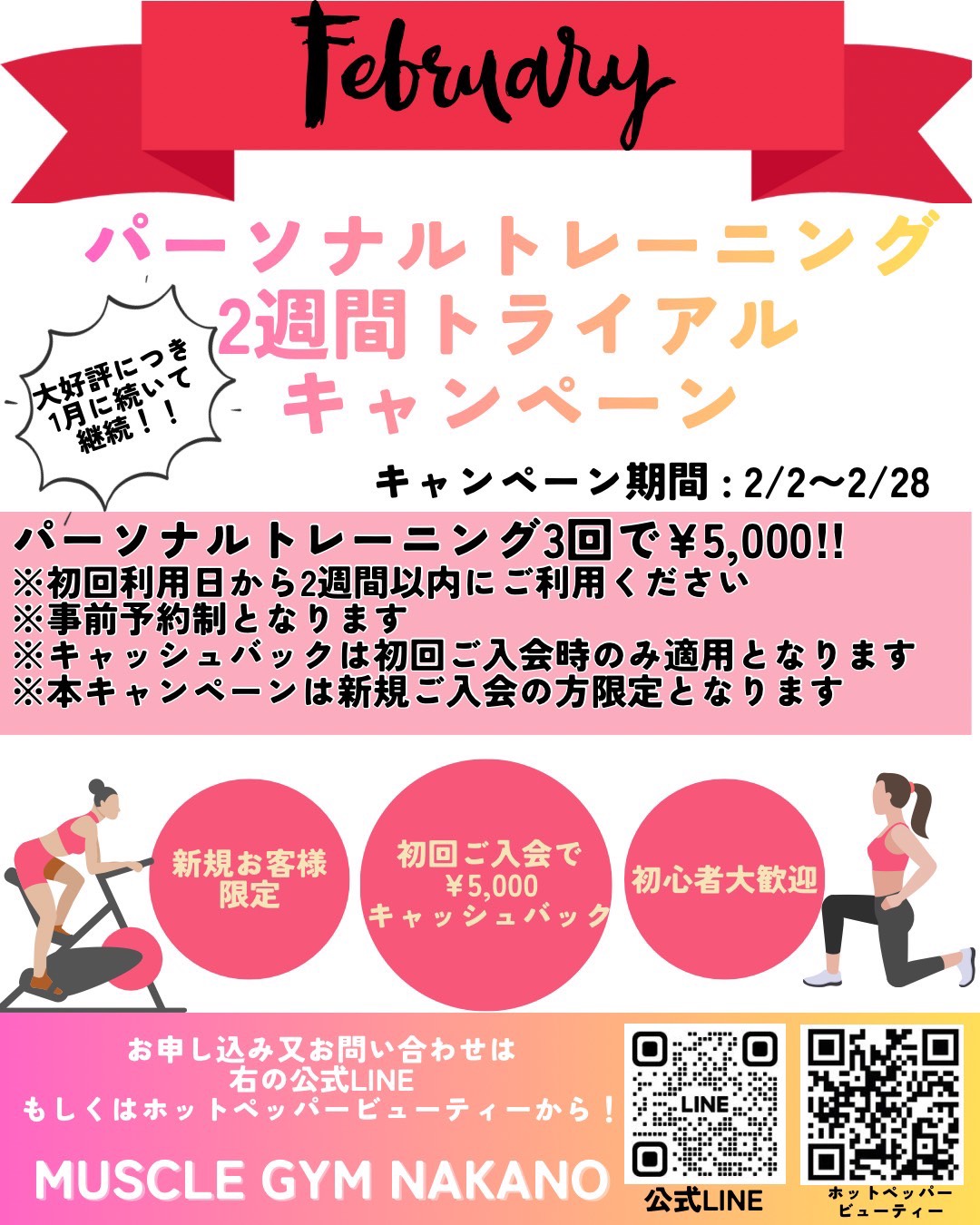 24時間コース・パーソナルトレーニングコースを対象に、2月限定のキャンペーンをご用意しました。